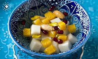 Küp doğranmış muhallebi, kayısı, nar, badem ve fıstık ekleyip hafif karıştırın ve servis yapın.